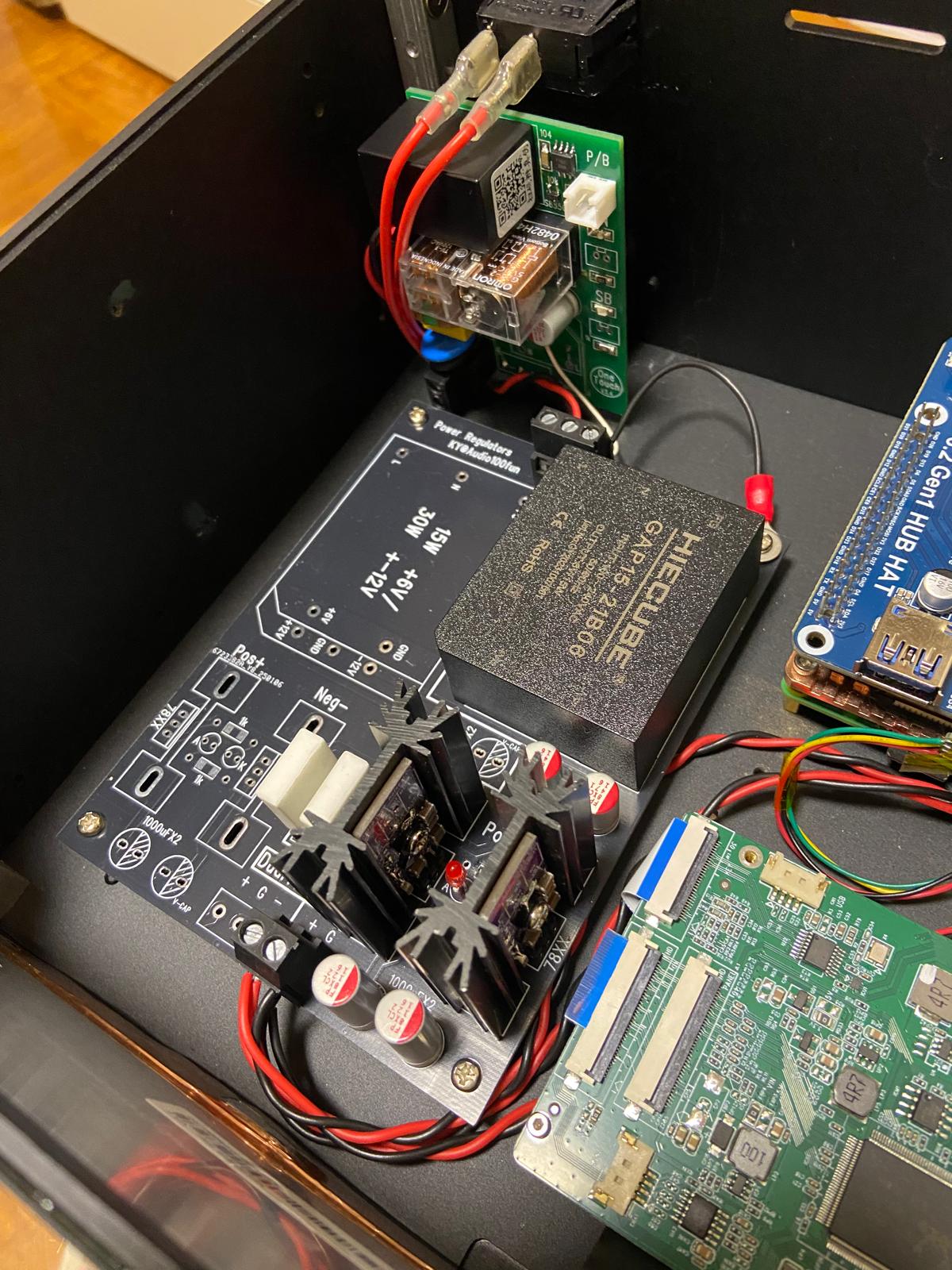 功能:輸入市電經變壓器再穩壓輸出到Raspberry pi 及其他模組使用。穩壓板左側預留一正一負輸出給DAC使用或作輔助供電其他模組。
