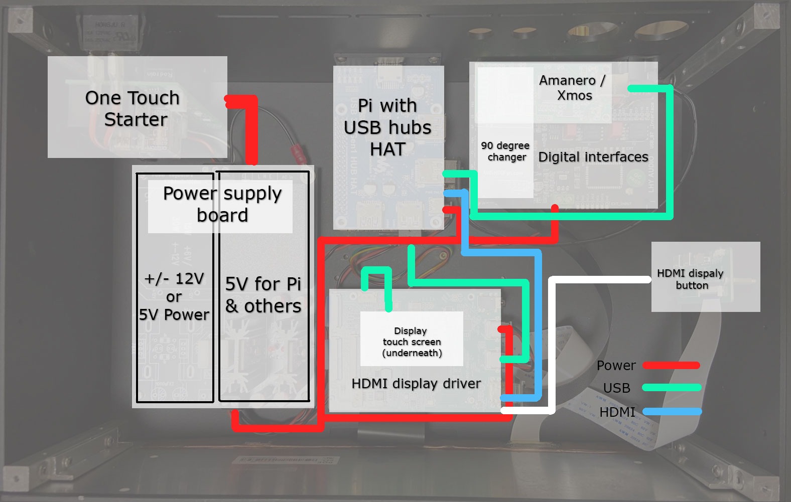 如果你不是像圖中使用2A 的背板, 你需要一條type A 的USB線在機背外面連接pi 和Amanero。